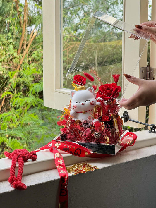 Smiling Fortune Cat Preserved Flower Arrangement 招财猫 | 金九银十限量款