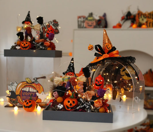 Halloween Preserved Flower Arrangement | Sweet Little Devil Theme | Witch Hat Dome Display | Spooky Centerpiece
